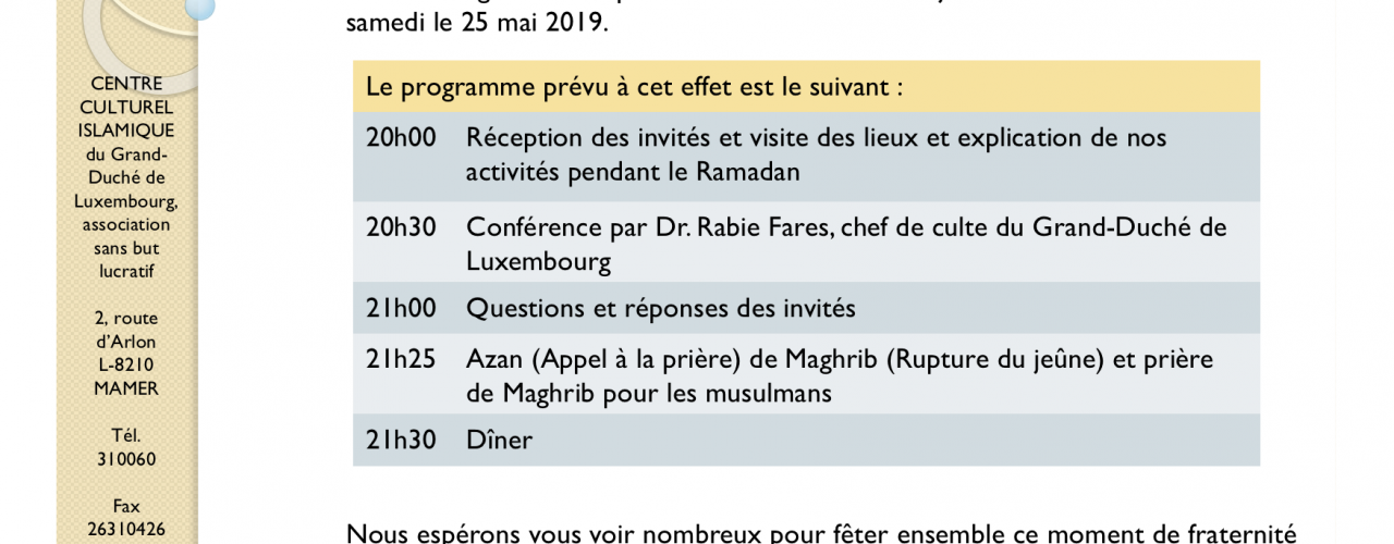 Le CCIL organise un repas à l’occasion du mois de jeûne du Ramadan samedi le 25 mai 2019